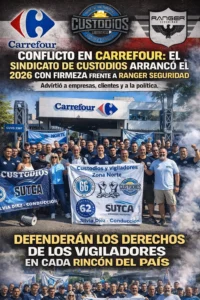 El Sindicato de Custodios llevó adelante en el día de hoy una medida de fuerza frente a Carrefour, en el marco de un conflicto que involucra a la empresa de seguridad Ranger Seguridad y que expone una problemática estructural de la actividad de la seguridad privada en todo el país.La jornada contó con una participación activa de delegados de base y trabajadores, quienes se hicieron presentes para visibilizar una serie de reclamos reiterados: persecución sindical, sanciones y traslados arbitrarios de delegados, incorrecta liquidación de horas extras, horas al 50% y 100%, feriados, aguinaldo y vacaciones, además…