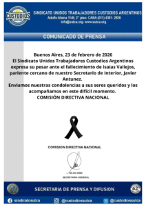 El Sindicato Unidos Trabajadores Custodios Argentinos repudia enérgicamente el grave episodio ocurrido en el día de ayer en la localidad de Moreno, en donde una trabajadora docente, Corina De Bonis, fue secuestrada y torturada en un hecho que nos recuerda la larga noche de las dictaduras cívico – militares. Este suceso se inscribe dramáticamente en una profundización de la criminalización de la protesta social y en particular en un ataque a los compañeros docentes que protagonizan un largo conflicto con las autoridades gubernamentales en su lucha por salarios dignos, condiciones…